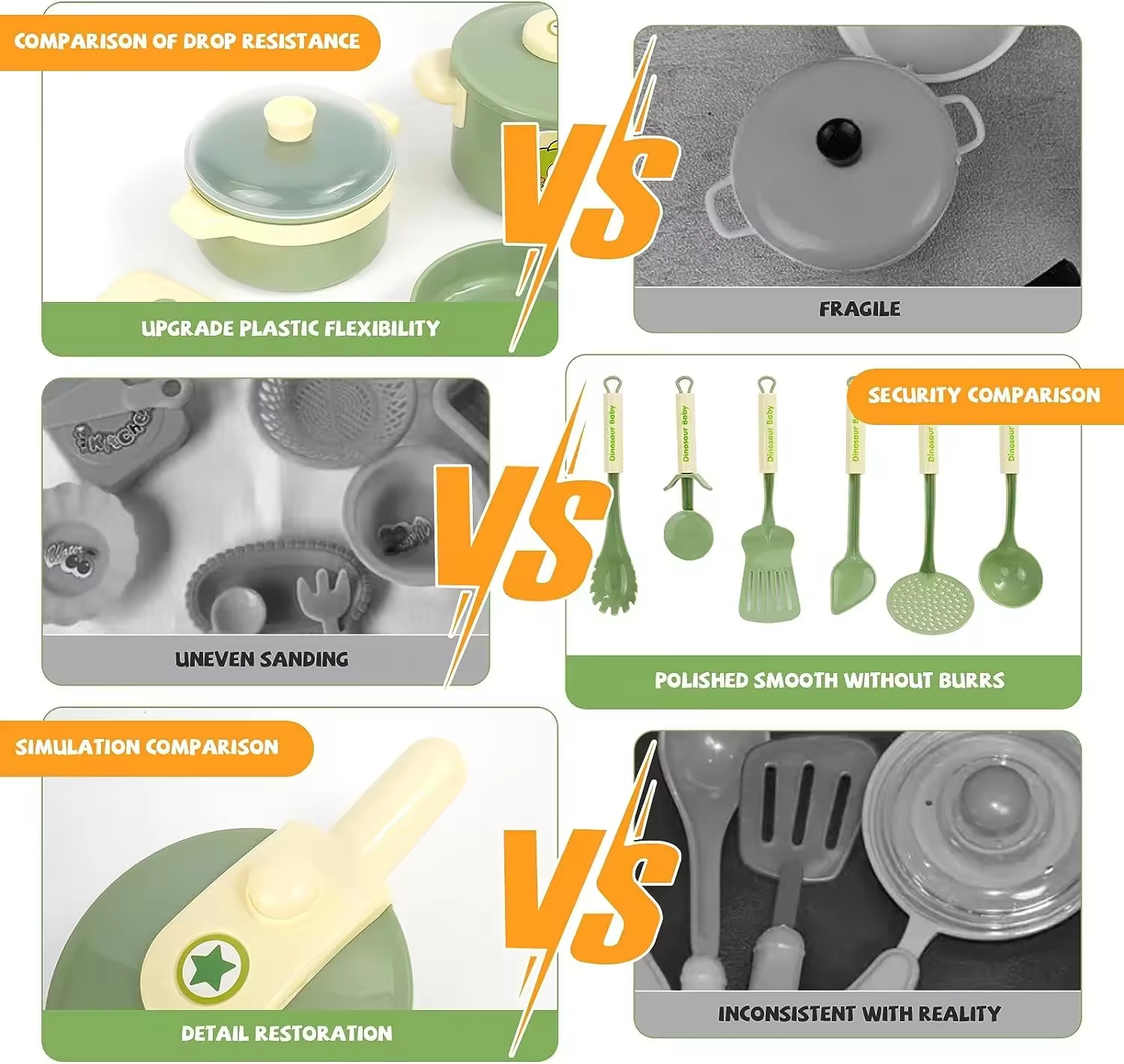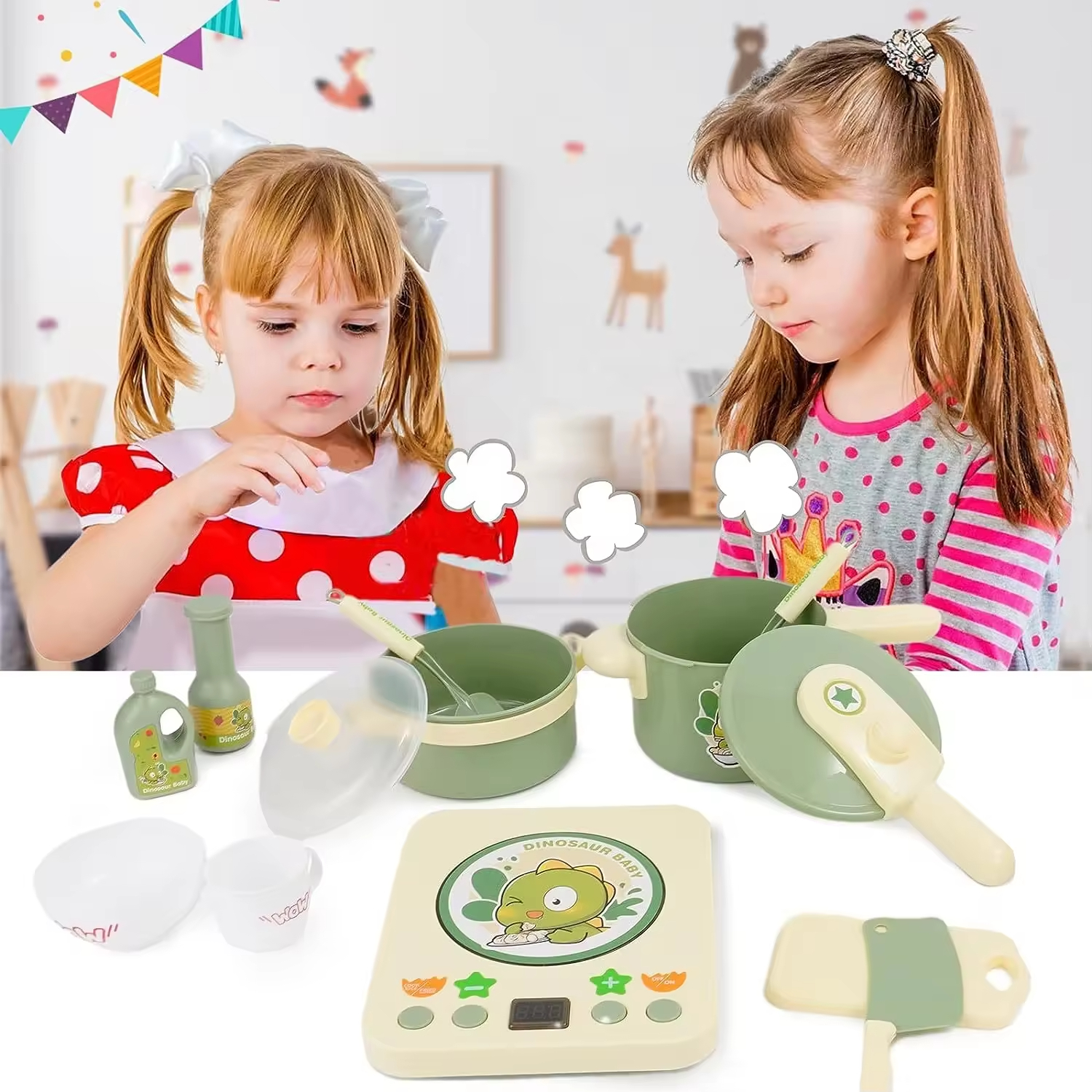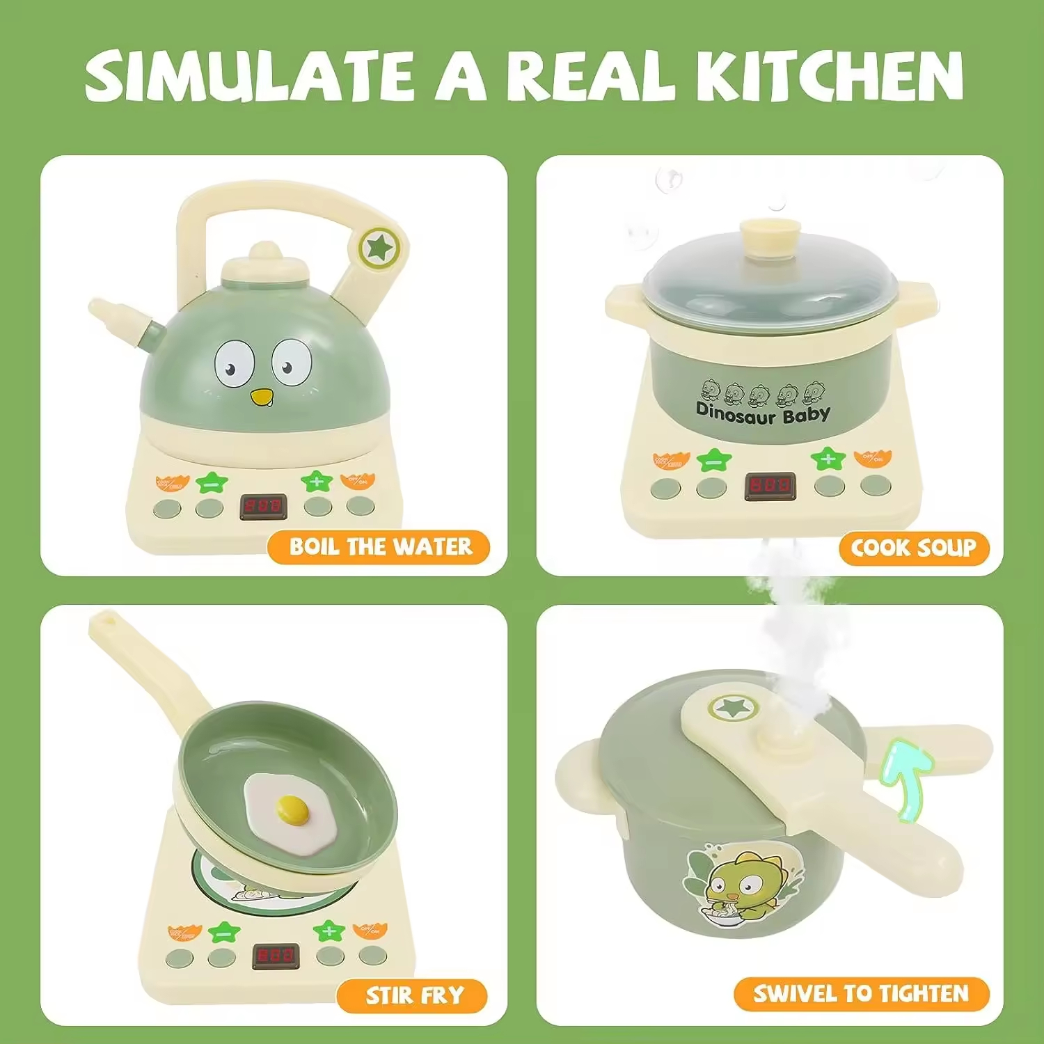 EPT 20PCS Dinosaur-Themed Kids Kitchen Play Set with Light & Sound Effects Toddler Pretend Cooking Utensils Toy Set for Kids